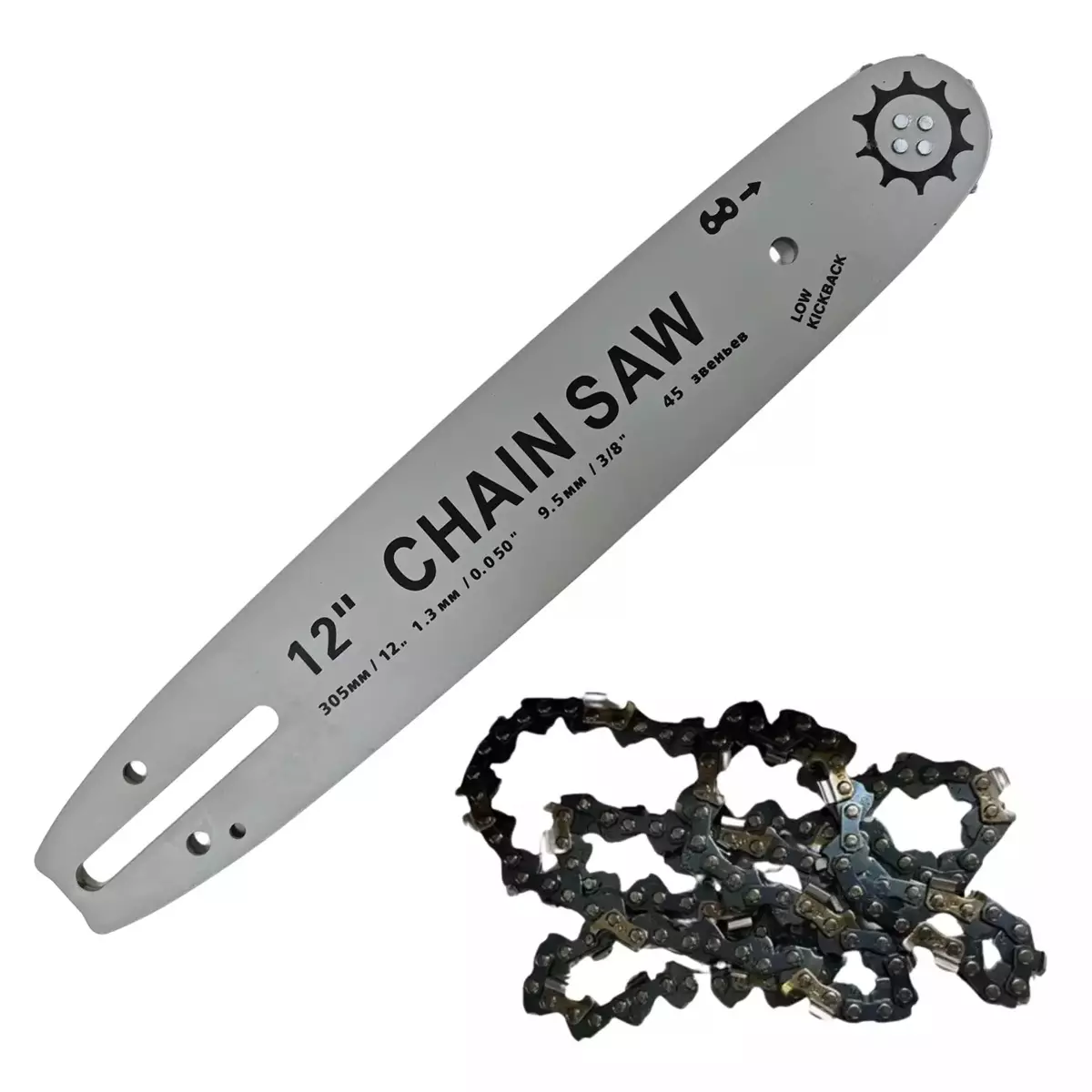 Robota lyhyempi, laippa ja teräketju 12" Robota DC-CS36V akkuketjusahaan. Yhteensopiva teräketju: - Vetolenkkien määrä 44 - Laipan pituus 12" - Jako 3/8"